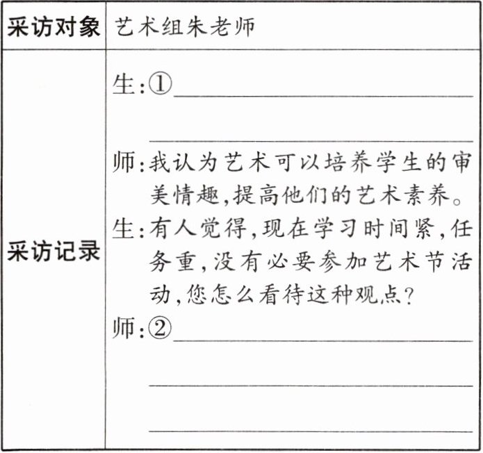 (1)①示例:您认为“艺术”在青少年成长过程中起着怎样的作用呢? ②示例:我觉得这种观点是错(不对)的。艺术节可以帮助学生放松身心,一定程度上有助于中学生缓解学习压力。