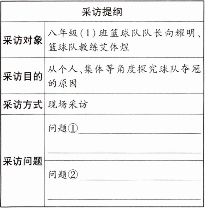 (2)学校篮球比赛圆满闭幕,老师组织大家开展采访活动。小语打算采访夺得冠军的八年级(1)班篮球队队长向耀明和篮球队教练艾体煜,下面是他初拟的采访提纲,请你补全。