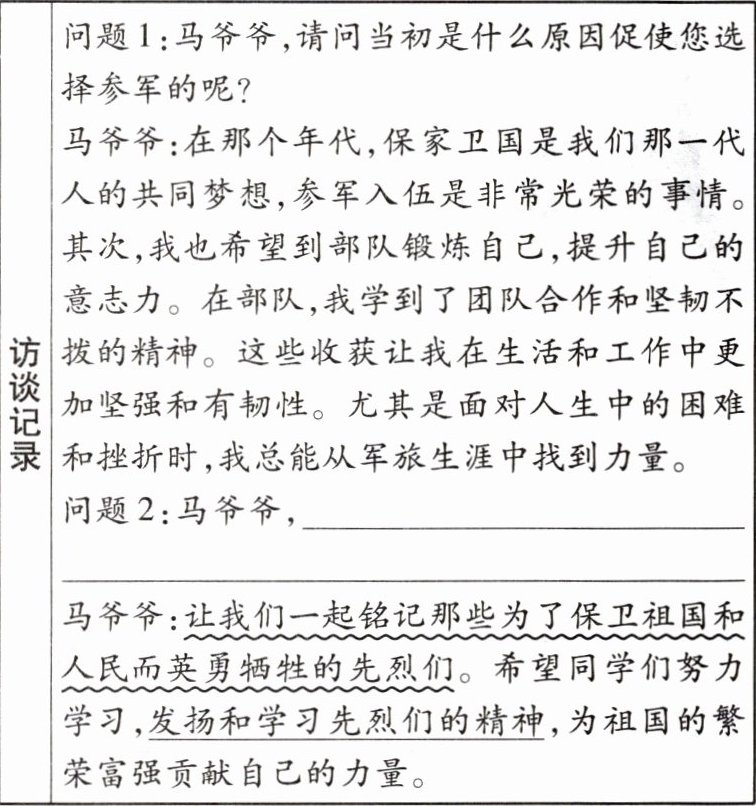1. [2025合肥期末]同学们在参观革命纪念馆的时候遇到了退伍军人马爷爷,广播站的小语对马爷爷进行了采访。阅读下面访谈记录的片段,根据采访内容,帮助小语完成采访并解决问题。