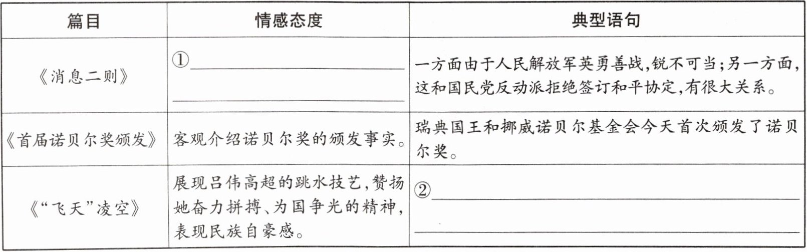 3. 【活动三:阅读课文,揣摩作者的态度与倾向】虽然新闻最讲求客观、准确,但也隐含着作者的情感态度。阅读本单元的课文,将下面的表格补充完整。