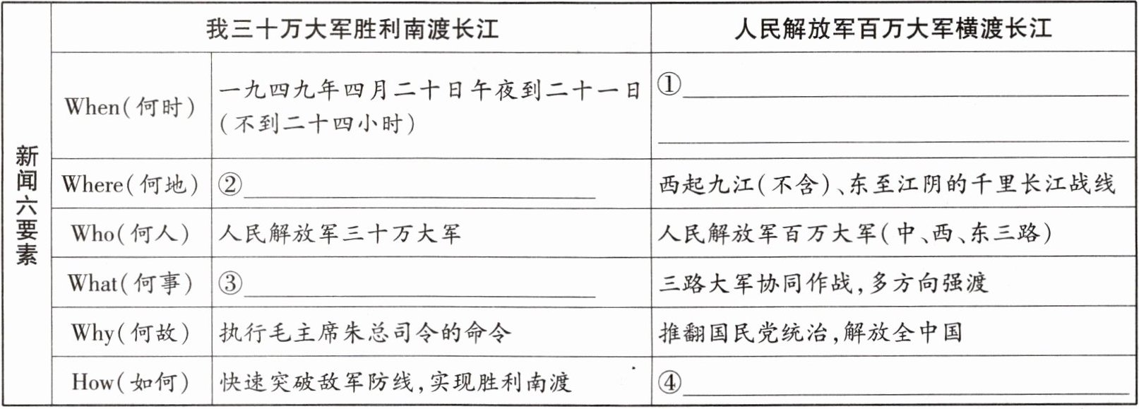 1.①一九四九年四月二十日夜到二十二日二十二时 ②芜湖、安庆之间的长江防线 ③突破敌阵,占领南岸广大地区 ④全面突破长江天堑,控制江阴要塞,切断国民党军退路