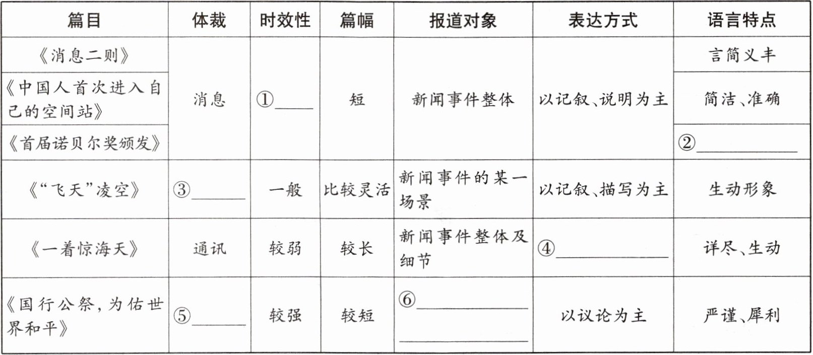 1. 【活动一:梳理新闻要素,把握内容】阅读本单元的六篇课文,请以《消息二则》为例,梳理新闻要素,把握新闻内容。