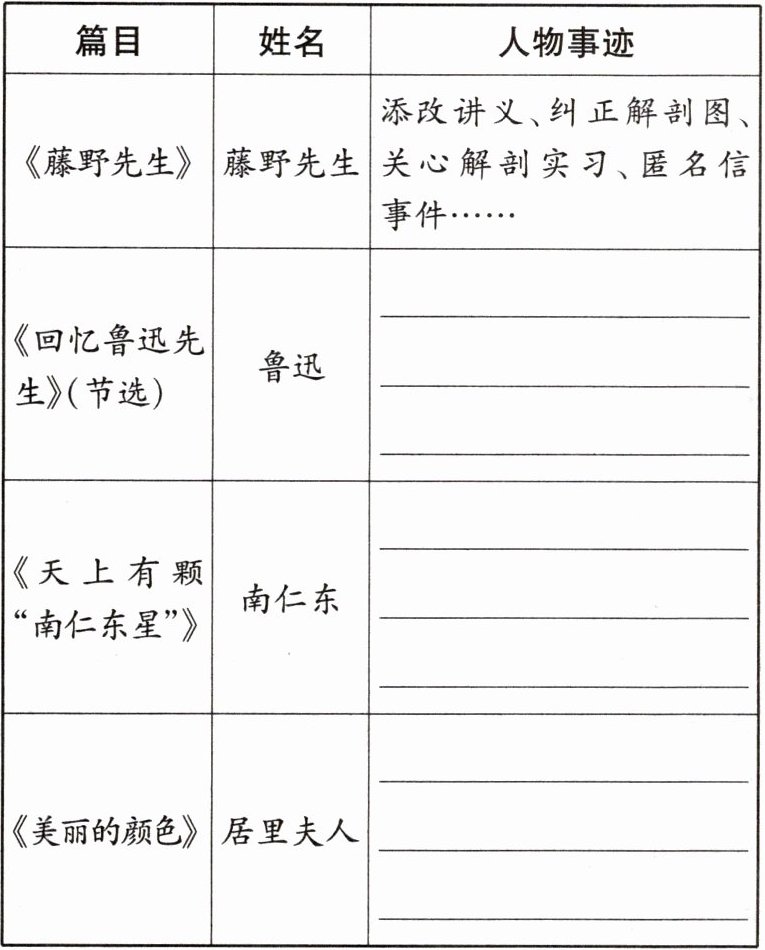 1. 本单元的课文叙述了难忘的人与事,小语想在此展区向大家展示本单元人物相关事迹,请结合他搜集的资料帮他完善。