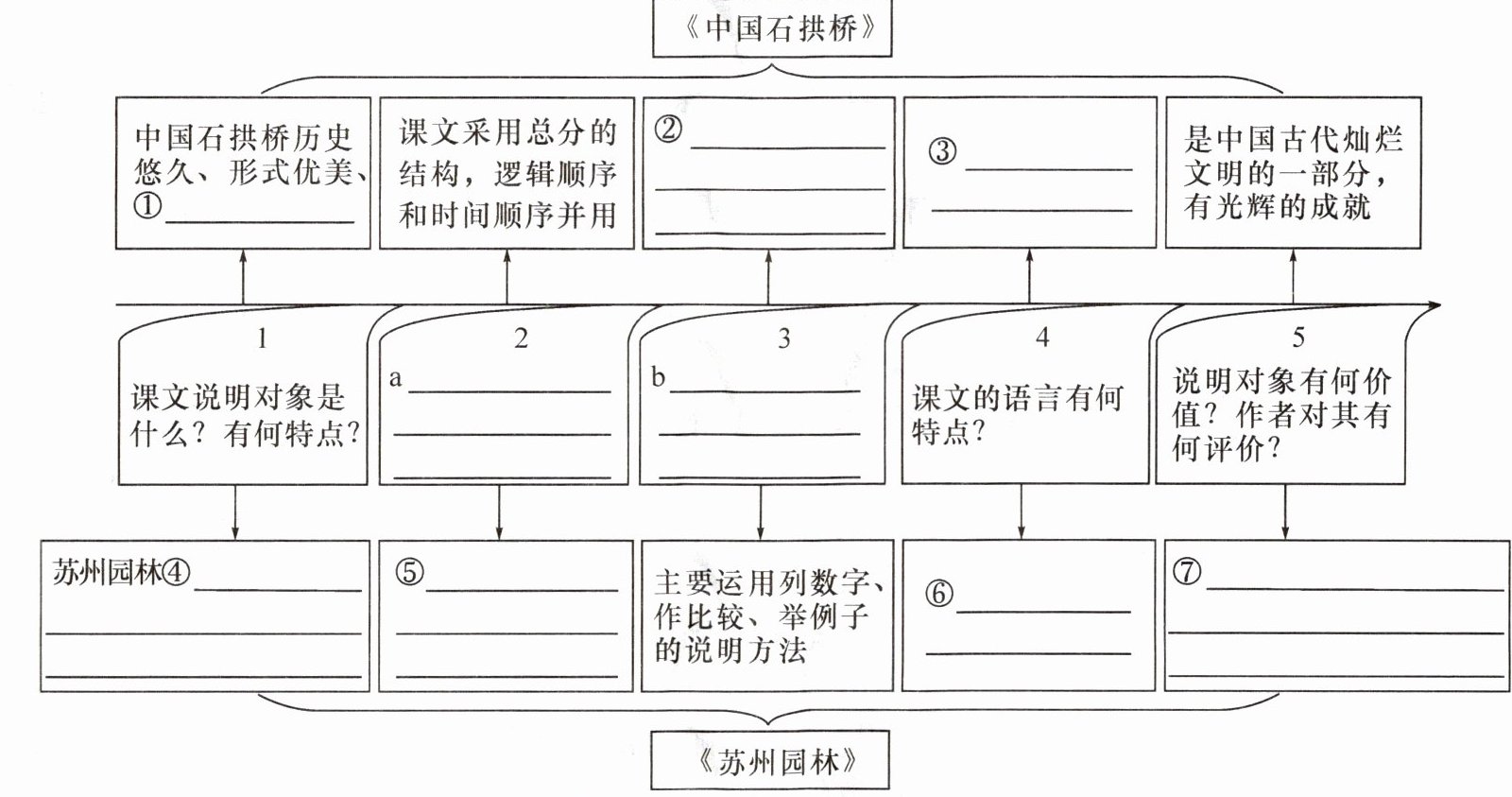 1.【活动一:浏览课文,提取主要信息】学习事物性说明文,我们要掌握课文说明事物的方法,以《中国石拱桥》《苏州园林》为例,完成下面的流程图。