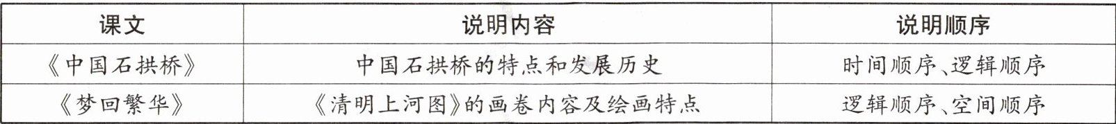 2.【活动二:关注内容,把握说明顺序】小语对本单元的部分说明文进行了整理,他对说明顺序的使用产生了一些疑惑,打算找同学小文一起探讨。请依据情境,补全他们的对话。