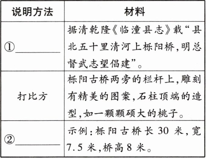 (3)【活动三:述说古桥】小晋准备写一篇介绍栎阳古桥的文章,请你根据收集到的资料,帮他完成下面的表格。(4 分)