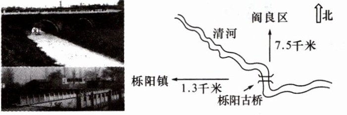 (1)示例:栎阳古桥位于阎良区以南7.5千米、栎阳镇以东1.3千米的清河上,桥面呈东西走向。(或:栎阳古桥位于清河上,呈东西走向,北距阎良区7.5千米,西距栎阳镇1.3千米。)