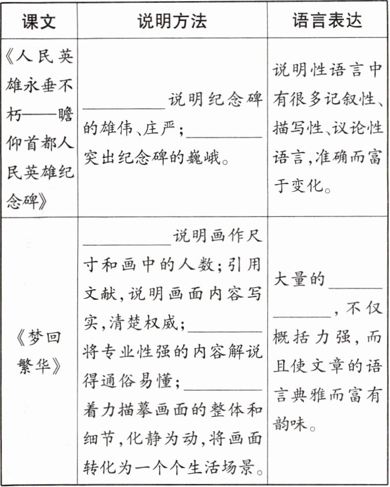 |《人民英雄永垂不朽——瞻仰首都人民英雄纪念碑》|列数字说明纪念碑的雄伟、庄严;打比方突出纪念碑的巍峨。|说明性语言中有很多记叙性、描写性、议论性语言,准确而富于变化。|