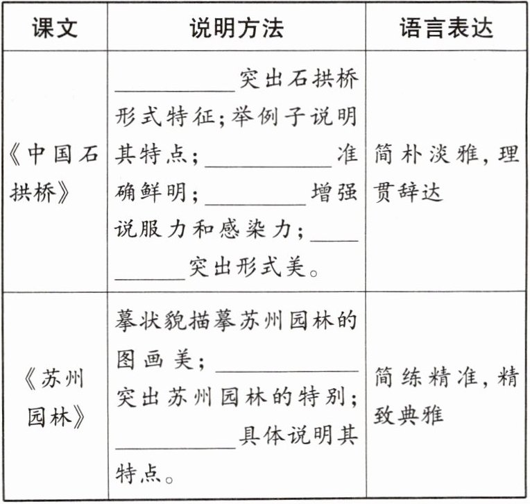 |《中国石拱桥》|打比方突出石拱桥形式特征;举例子说明其特点;列数字准确鲜明;引用增强说服力和感染力;摹状貌突出形式美。|简朴淡雅,理贯辞达|