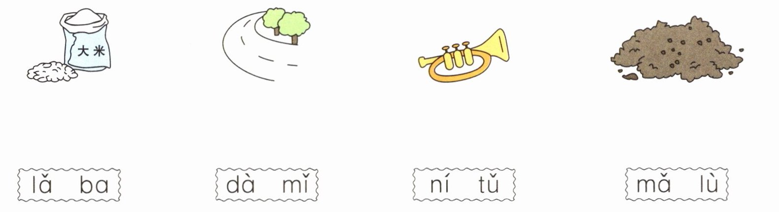 (第一幅图连dà mǐ,第二幅图连mǎ lù,第三幅图连lǎ ba,第四幅图连ní tǔ)