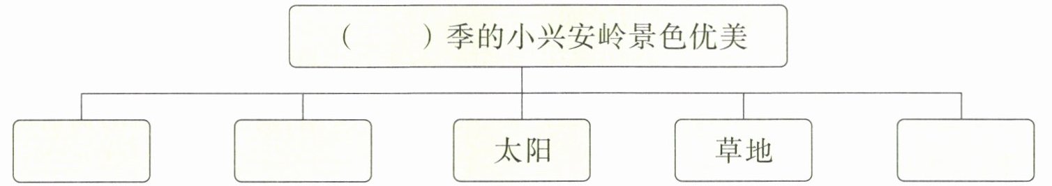 得严严实实的,挡住了人们的视线,遮住了蓝蓝的天空。早晨,雾从山谷里升起来,整个森林浸在乳白色的浓雾里。太阳出来了,千万缕耀眼的金光穿过树梢,照射在工人宿舍门前的草地上。草地上盛开着各种各样的野花,红的、白的、黄的、紫的,真像个美丽的大花坛。1. 根据选文内容,完成下列思维导图。
