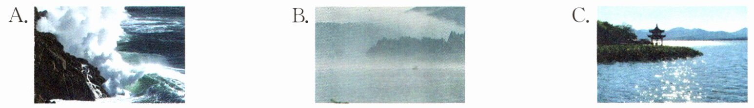 2. 泛舟湖上,阳阳冒着蒙蒙细雨拍下了一张风景照。旅游归来,他把照片贴在日记本上,并在旁边写下《饮湖上初晴后雨》中的那句“