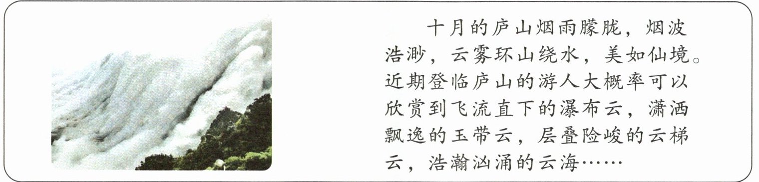 3. 阳阳来到山顶,看到庐山的云雾瞬息万变,请你结合材料二,用上“刚刚还是……一会儿工夫……”帮阳阳描绘一下眼前的景色:_
