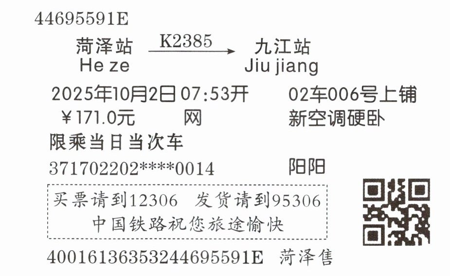 [材料一]看了纪录片《跟着课本去旅行》,阳阳同学也想去看一看课本中位于江西省九江市的庐山的真面目,“十一”假期,他就和妈妈踏上了去往九江市的列车,开启了难忘的庐山之旅。(上图是阳阳的车票)