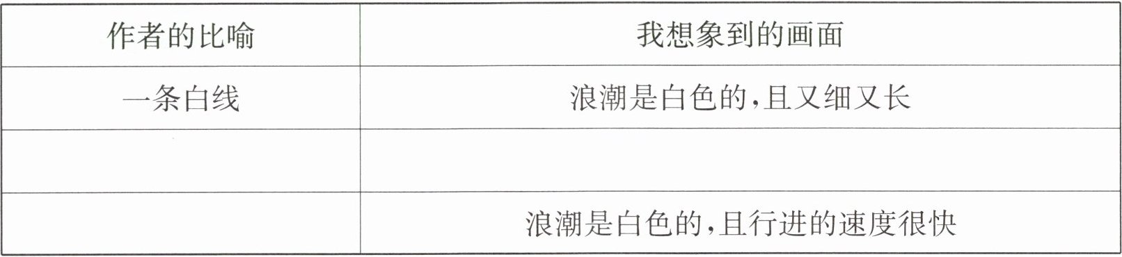 3. (语文要素)作者运用了形象的比喻描写浪潮形态,请你根据提示完成下面的表格。