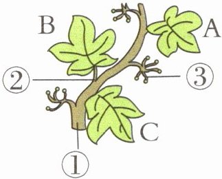 (2)B 示例:爬山虎的叶尖一顺儿朝下,图中B的叶尖朝上
