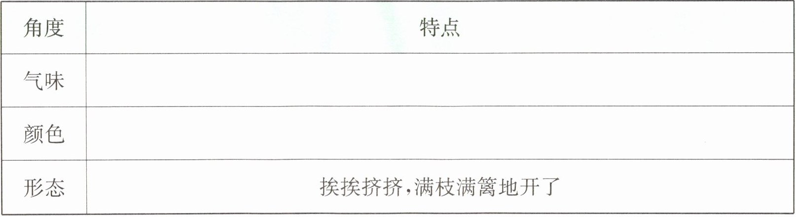 1. 时间 ② 2. 春:D 夏:A 秋:B 冬:C 3. 还没打花苞的嫩条 竹笋子 生动形象地写出了这些嫩条的生机勃勃。 4. 气味:浓郁而甜蜜 颜色:纯白的,浅粉的,黄蕊