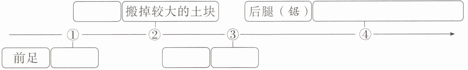 1.①扒土 ②大颚 ③后足 踏地 ④将泥土推到后面,倾斜地铺开 细致 2.A 3.挖掘 整修 十月(或秋天初寒的时候) 冬天 连续