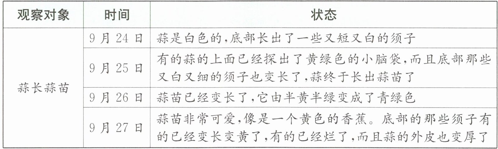 |观察对象|时间|状态(可从视觉、听觉、触觉、味觉入手)|