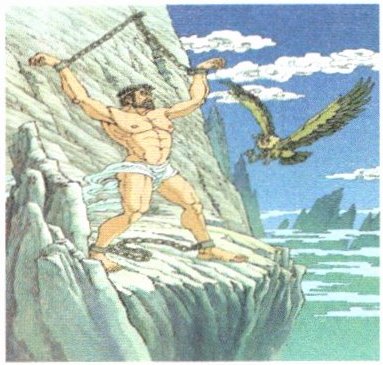 火神不敢违抗宙斯的命令,只好把普罗米修斯押到高加索山上。普罗米修斯双手和双脚戴着铁环,被死死地锁在高高的悬崖上。他既不能动弹,也不能睡觉,日夜遭受着风吹雨淋的痛苦。尽管如此,普罗米修斯就是不向宙斯屈服。