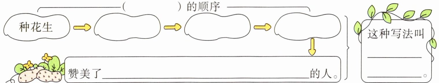 (从左到右)事情发展 收花生 尝花生 议花生 借物喻人 朴实无华、默默无闻、不计较名利