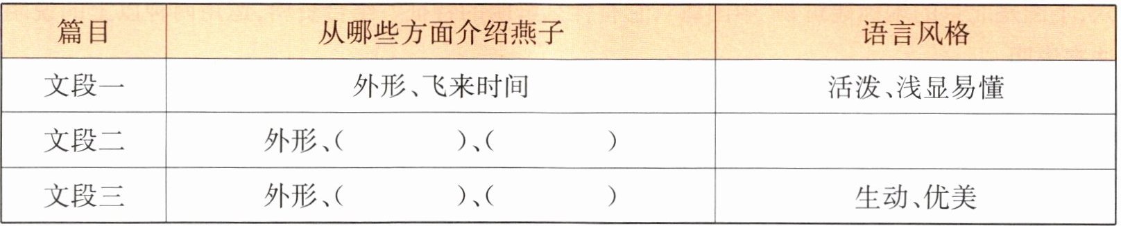 (2)不能。“之一”说明燕子是最善飞翔的鸟类中的一种,如果去掉“之一”,就说明燕子是鸟类中最善飞翔的,与事实不符。这体现了说明文语言的准确性、严谨性。 3.示例:燕子全身的羽毛为乌黑色,看上去像黑绸缎似的。它的一对翅膀展开长约24~28厘米,尾羽平展时就像一把打开的剪刀。