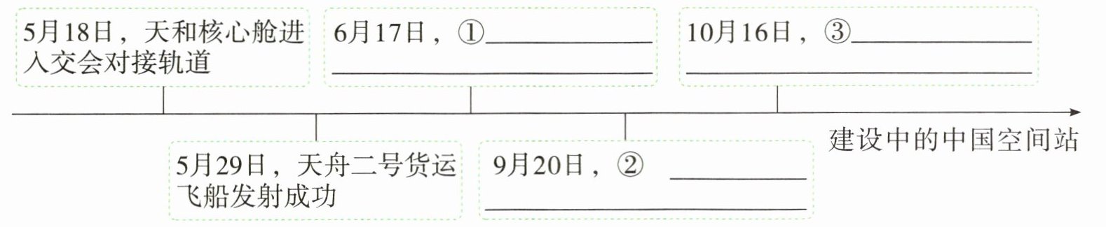 ③2021年5月18日,我国空间站天和核心舱完成在轨测试验证,进入交会对接轨道,等待天舟二号货运飞船的到访。5月29日晚,我国在海南文昌航天发射场准时点火发射天舟二号货运飞船。6月17日,神舟十二号载人飞船发射成功,与天和核心舱完成自主快速交会对接,航天员进入天和核心舱。之后,航天员进行中国空间站首次出舱活动。9月20日,天舟三号货运飞船在海南文昌航天发射场成功发射。10月16日,神舟十三号载人飞船与空间站组合体完成自主快速交会对接。航天员翟志刚、王亚平、叶光富进驻天和核心舱,中国空间站开启有人长期驻留时代。12月9日下午3点40分,“天宫课堂”正式开讲,神舟十三号航天员在中国空间站上进行全球直播,为全世界网友授课。