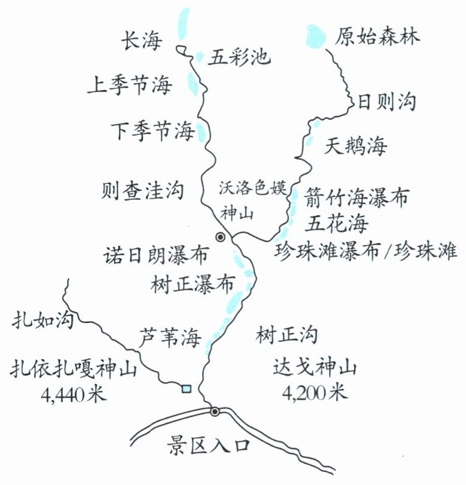 示例:芦苇海→树正瀑布→诺日朗瀑布→珍珠滩瀑布→五花海→箭竹海瀑布→原始森林