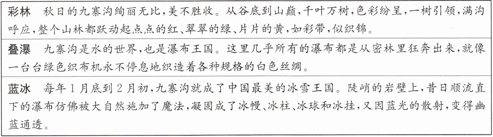 1.九寨沟的水最多最好,其他地方的水都比不上 C 2.D 3.蓝冰 示例:芦苇海→树正瀑布→诺日朗瀑布→珍珠滩瀑布→五花海→箭竹海瀑布→原始森林(提示:设计路线时需要偏重瀑布和森林)