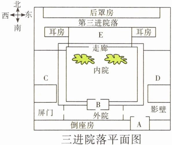 3. 结合材料三想一想:把“正门、垂花门、正房、东厢房、西厢房”填写到三进院落平面图 A、B、C、D、E 相应的位置,应该怎样填?写在下面对应的括号里。