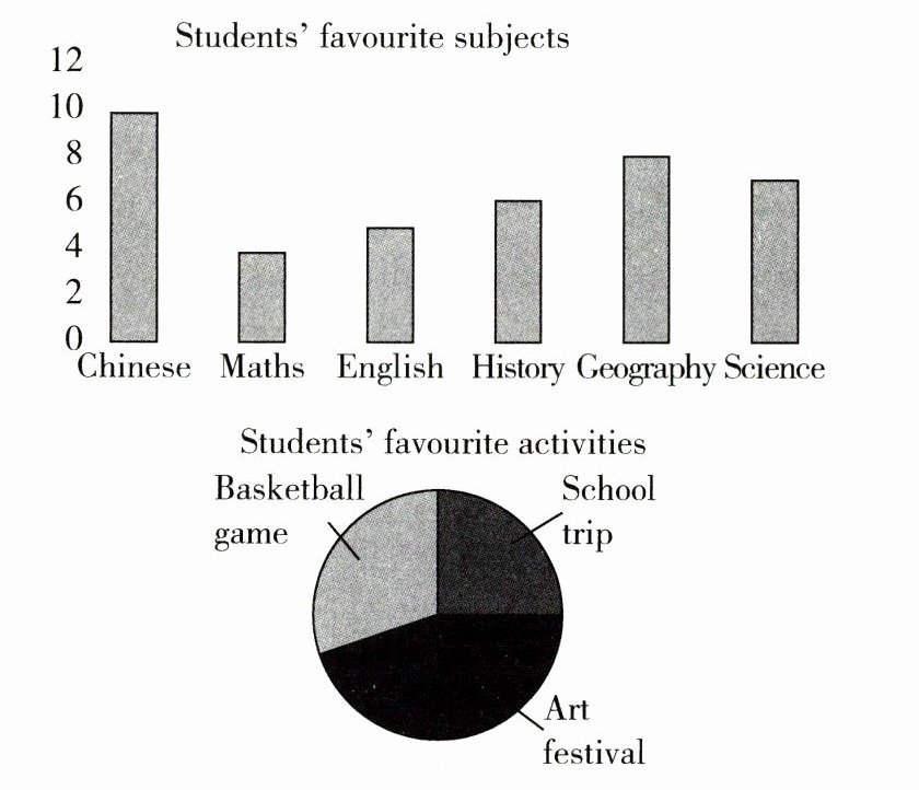 Hello, my name is David. I study in No. 5 Middle School. I'm in Class 2, Grade 7. Here is a survey(调查)about my classmates' favourite subjects and activities(活动).