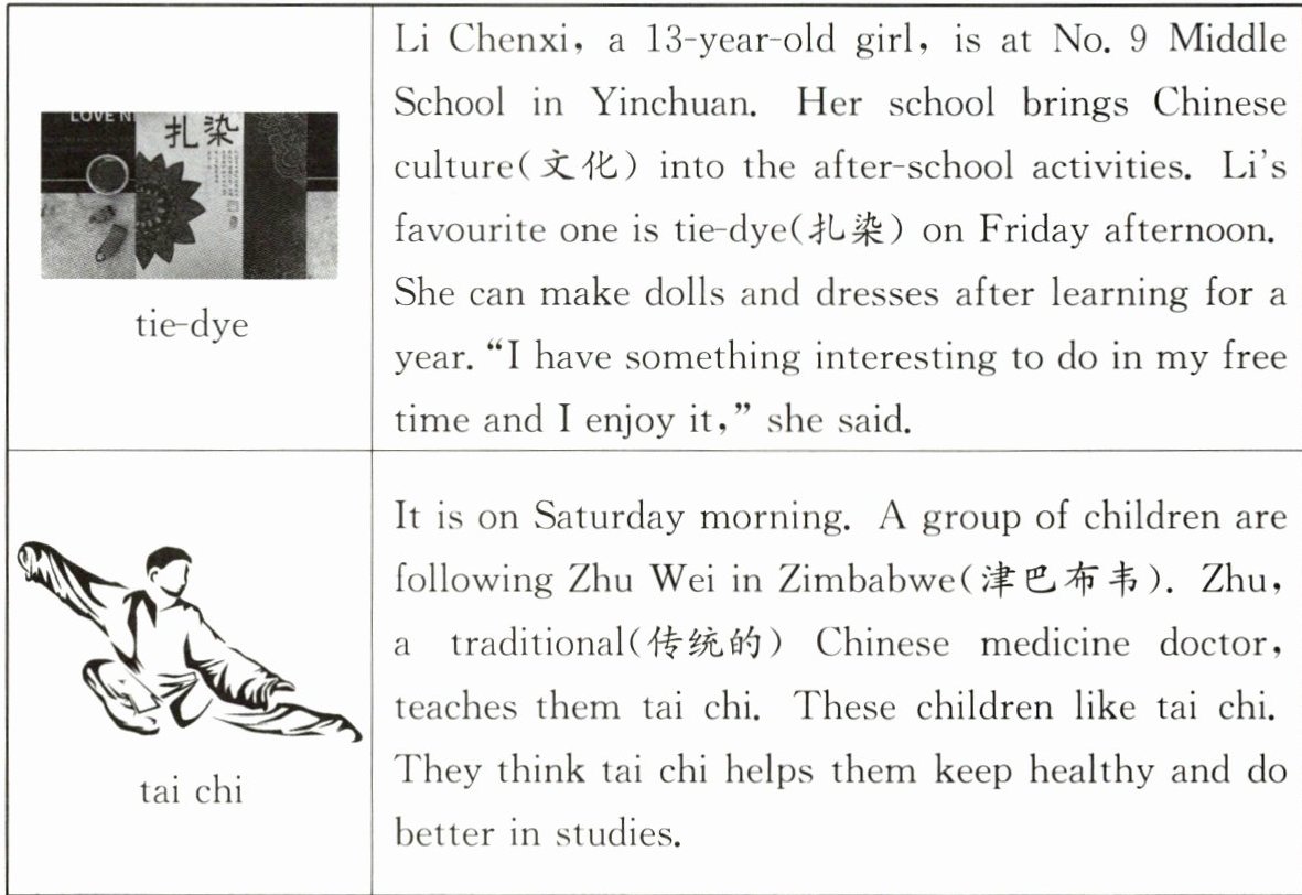 Li Chenxi, a 13-year-old girl, is at No. 9 Middle School in Yinchuan. Her school brings Chinese culture(文化) into the after-school activities. Li’s favourite one is tie-dye(扎染) on Friday afternoon. She can make dolls and dresses after learning for a year. “I have something interesting to do in my free time and I enjoy it,” she said.