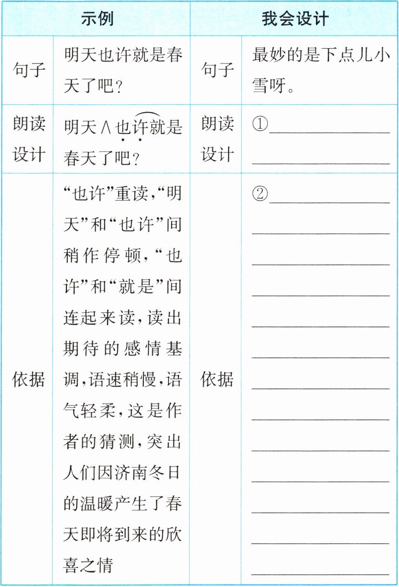 |依据:“也许”重读,“明天”和“也许”间稍作停顿,“也许”和“就是”间连起来读,读出期待的感情基调,语速稍慢,语气轻柔,这是作者的猜测,突出人们因济南冬日的温暖产生了春天即将到来的欣喜之情|依据:②______________________________|