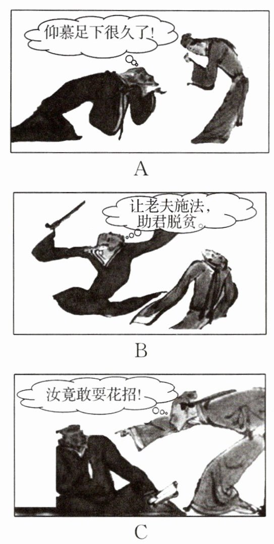 3. 为了让文学角更美观,同学们以这篇文章内容为素材,设计了以下三幅插图。请根据情节判断,下列选项中不符合本文内容的一幅插图是(3 分)( )