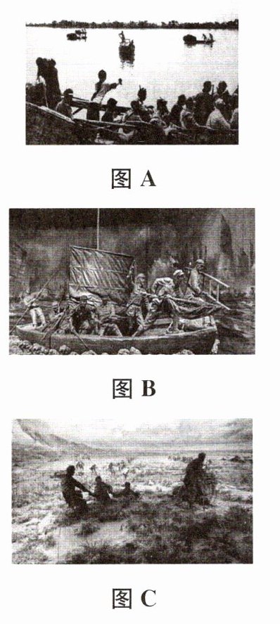 图A:画面呈现的是解放军渡江的场景,众多解放军战士乘坐船只在水面上行进,符合渡江战役中解放军渡江作战的情景。