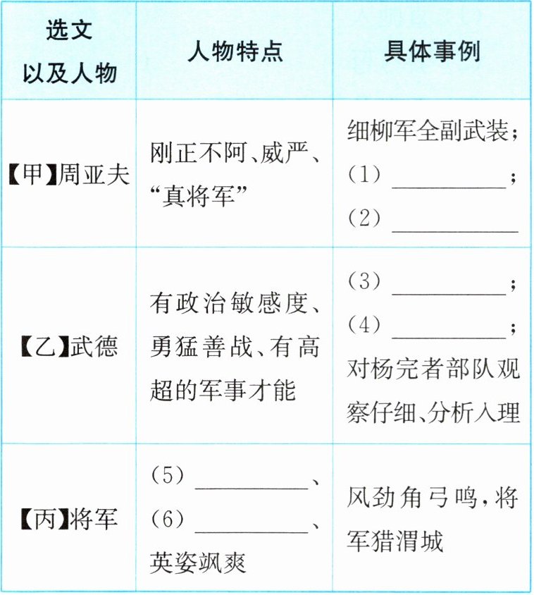 | 【甲】周亚夫 | 刚正不阿、威严、“真将军” | 细柳军全副武装;(1)______;(2)______ |