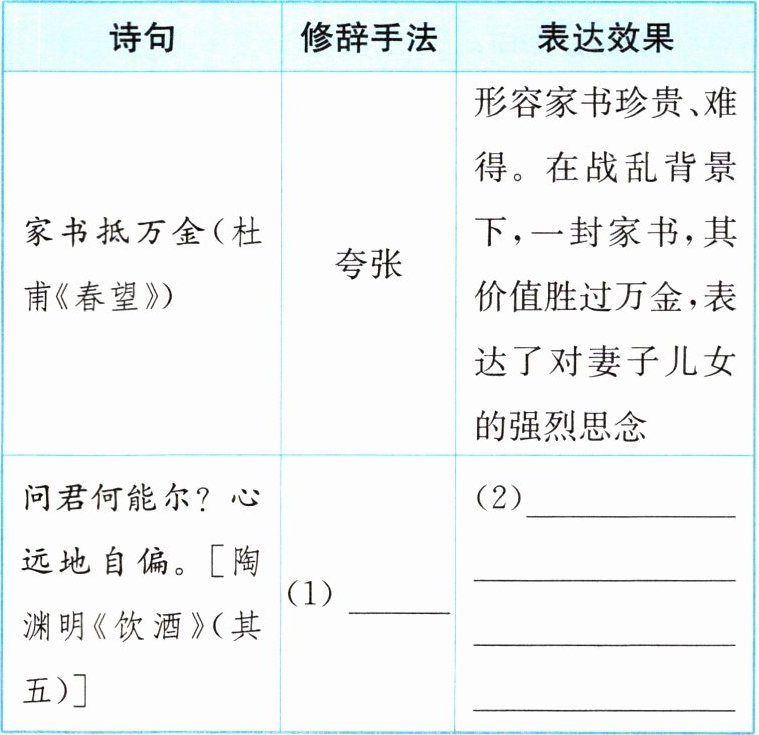 | 家书抵万金(杜甫《春望》) | 夸张 | 形容家书珍贵、难得。在战乱背景下,一封家书,其价值胜过万金,表达了对妻子儿女的强烈思念 |