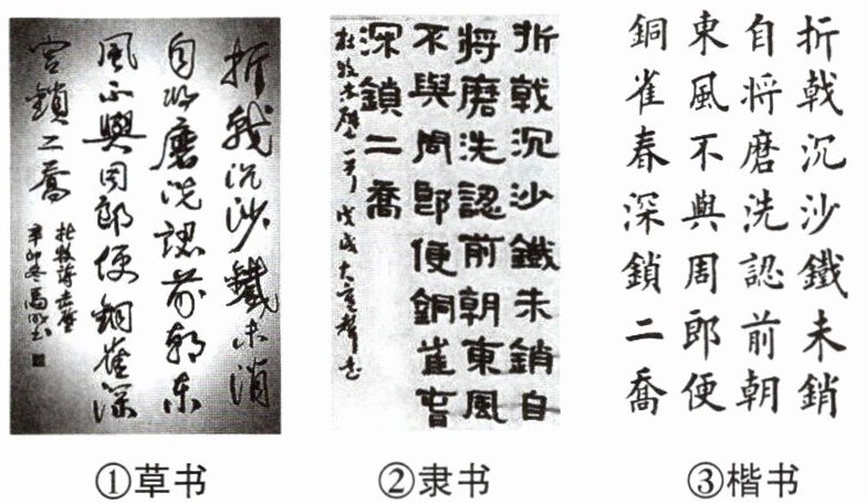 1. 三名同学根据自己对《赤壁》一诗的理解,写了以下三幅书法作品。你认为哪幅书法作品更能体现诗歌精髓?请说明理由。(提示:可从书体特点、诗歌的内容与思想情感的角度入手)(3 分)