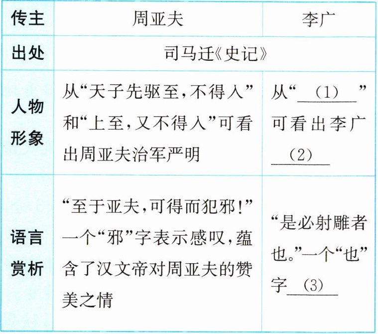 |人物形象|从“天子先驱至,不得入”和“上至,又不得入”可看出周亚夫治军严明|从“____(1)____”可看出李广____(2)____|