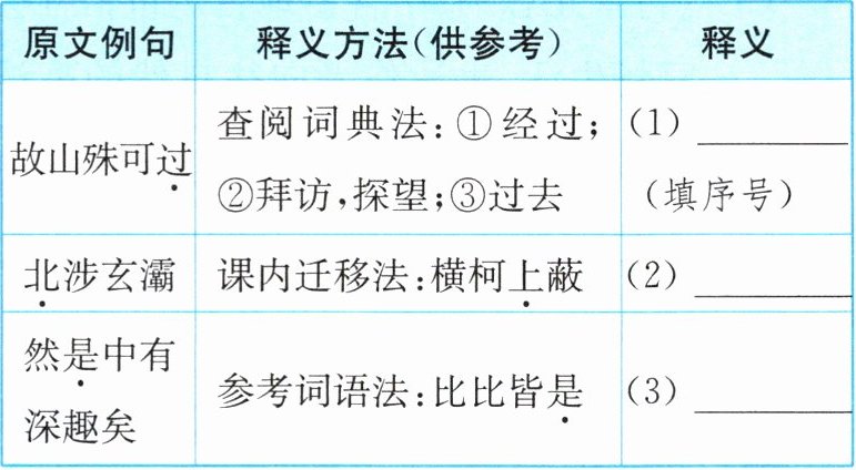 | 故山殊可过 | 查阅词典法:①经过;②拜访,探望;③过去 | (1)(填序号) |