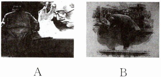 [示例一]我选图A,图A主要由身穿旧式长袍的老人的背影和手扶额头戴着眼镜的青年男子构成,表现了父亲的沧桑和“我”的怅惘,符合《背影》表现的深沉主题。