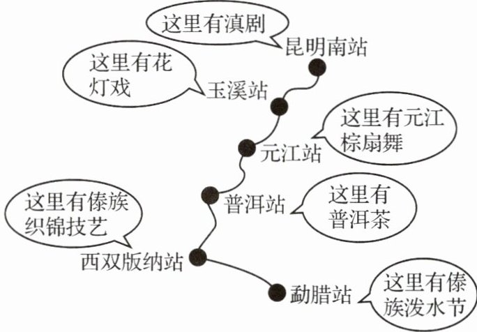 [示例一]推荐路线一。沿着这条路线可以探访滇剧、元江棕扇舞和傣族泼水节,这些都属于非物质文化遗产,探访起来会更有针对性。