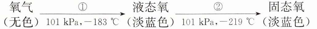 氧气$\xrightarrow[(无色)]{①}液态氧\xrightarrow[101\ kPa,-183\ ^\circC(淡蓝色)]{②}$固态氧