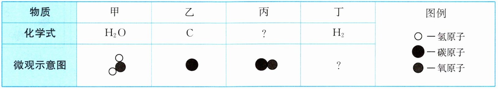 | 化学式 |$ H_2O $| C | ? |$ H_2 $| ○一氢原子 ●一碳原子 ●一氧原子 |