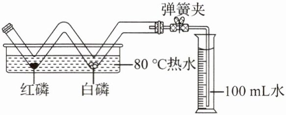 步骤①:检查装置气密性;步骤②:向 W 形玻璃管中放入过量的红磷和过量的白磷,塞好橡胶塞,夹紧弹簧夹,将 W 形玻璃管放入 $80\ ^{\circ}C$ 的热水中;步骤③:待步骤②中白磷熄灭,装置冷却至室温后,打开弹簧夹,最终观察到量筒中的水剩余 $51\ mL$。