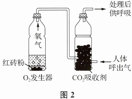 (3) 某同学在家自制$O_2$发生器和$CO_2$吸收器组合装置(如图$2),O_2$发生器内先放入红砖粉作催化剂,然后倒入一定浓度的过氧化氢溶液$,O_2$发生器内发生反应的化学方程式为 ,下列三种固体物质,可作为$CO_2$吸收剂的固体是 。