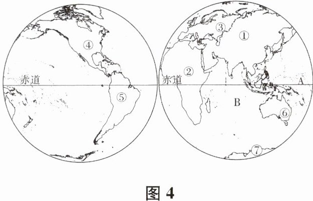 (填“东”或“西”)半球的陆地面积较大。(2)圈码①~⑦代表七大洲,我国位于七大洲中的