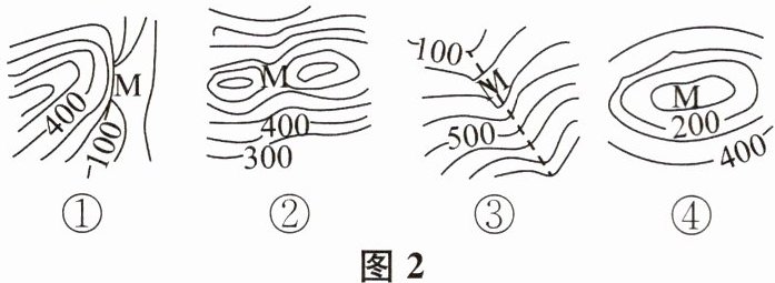 3. 图2中四幅“等高线地形图(单位:米)”中,M处对应地形部位正确的是(