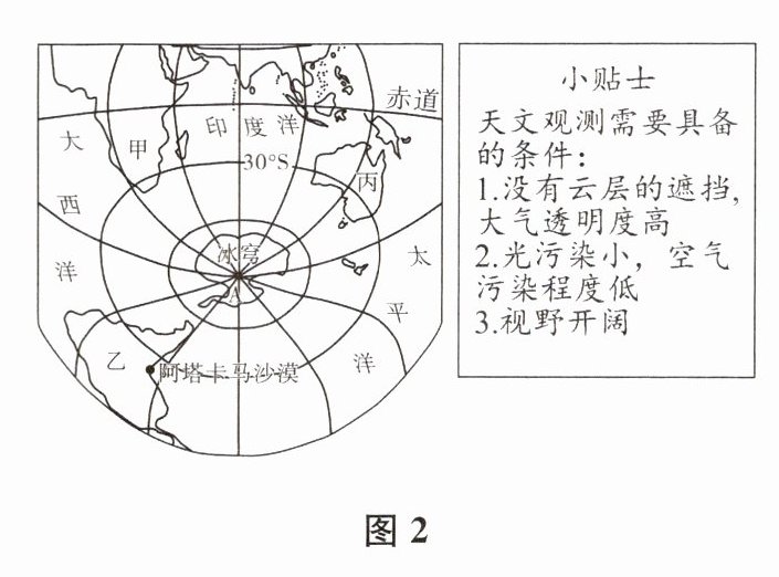 我国与智利合作共建的天文观测基地位于阿塔卡马沙漠中,海拔2900米。另外,我国南极天文观测基地位于南极冰穹A附近,海拔4087米。图2示意世界局部及相关文字资料。读图完成3~4题。