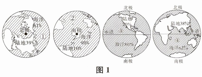 读图1“不同半球地球表面海陆面积所占比例图”,完成1~2题。